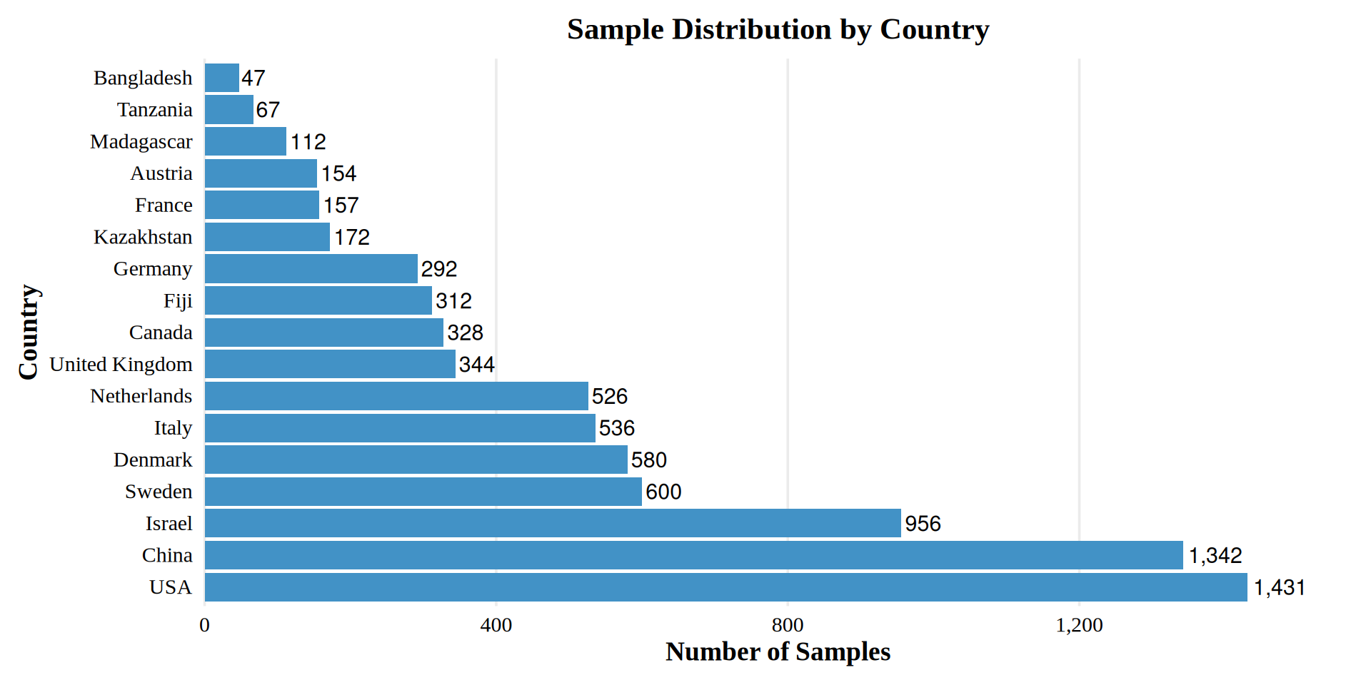 This large-scale study includes a total of 9,251 samples collected from various human body sites and countries.